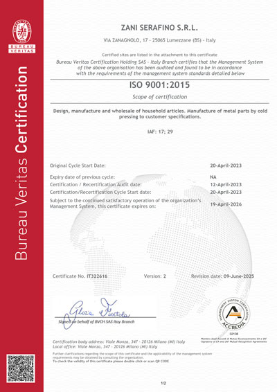 Zani Serafino S.r.l., active since 1963 in the production and marketing of cookware and kitchenware, bases its business on a well-established culture of quality, combining artisanal tradition with industrial innovation.
