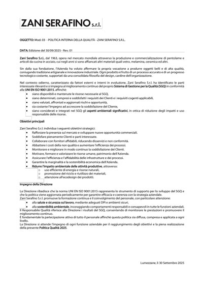 Zani Serafino S.r.l., attiva dal 1963 nella produzione e commercializzazione di pentolame e articoli da cucina, fonda la propria attività su una consolidata cultura della qualità, che coniuga tradizione artigianale e innovazione industriale.